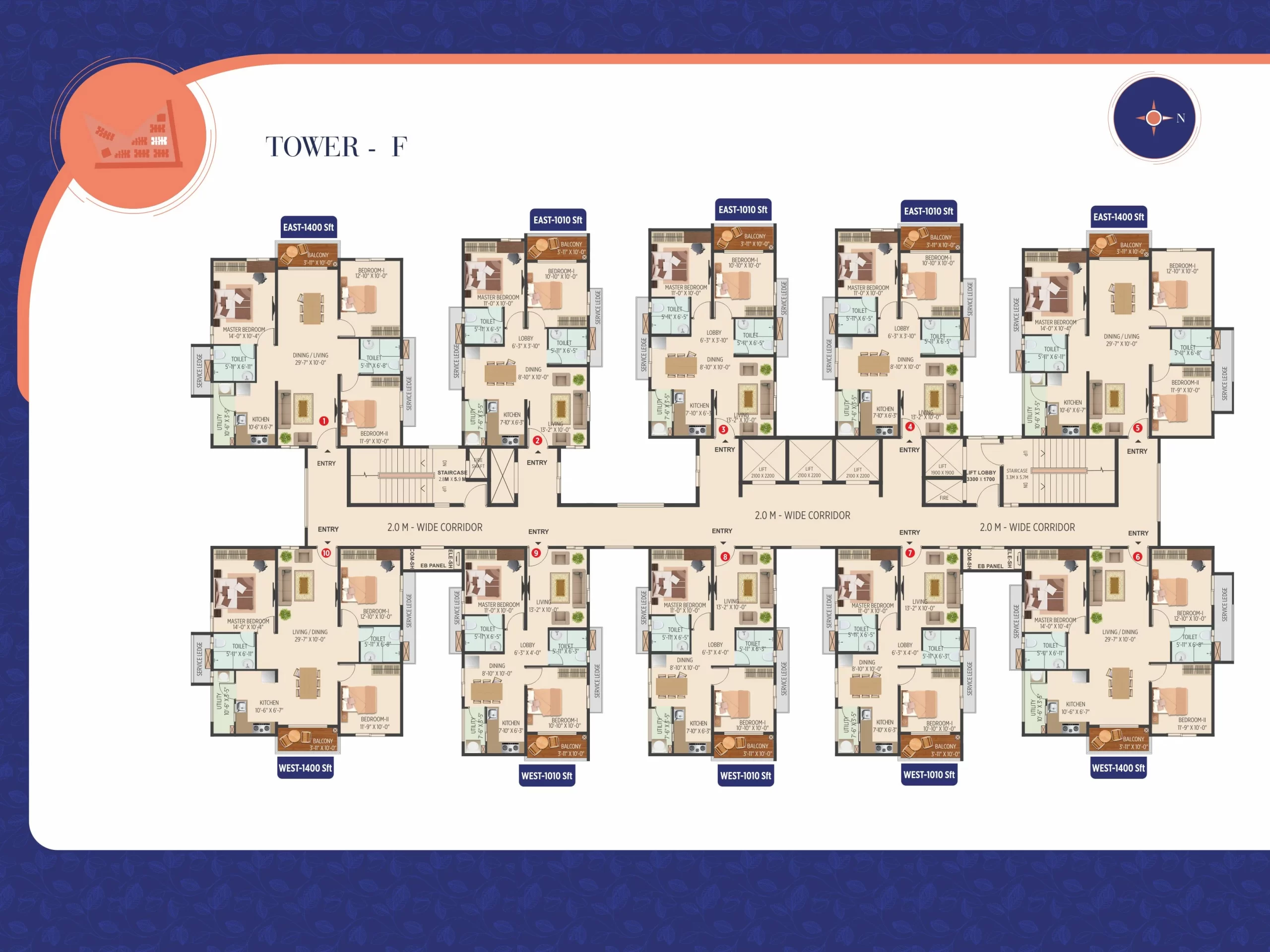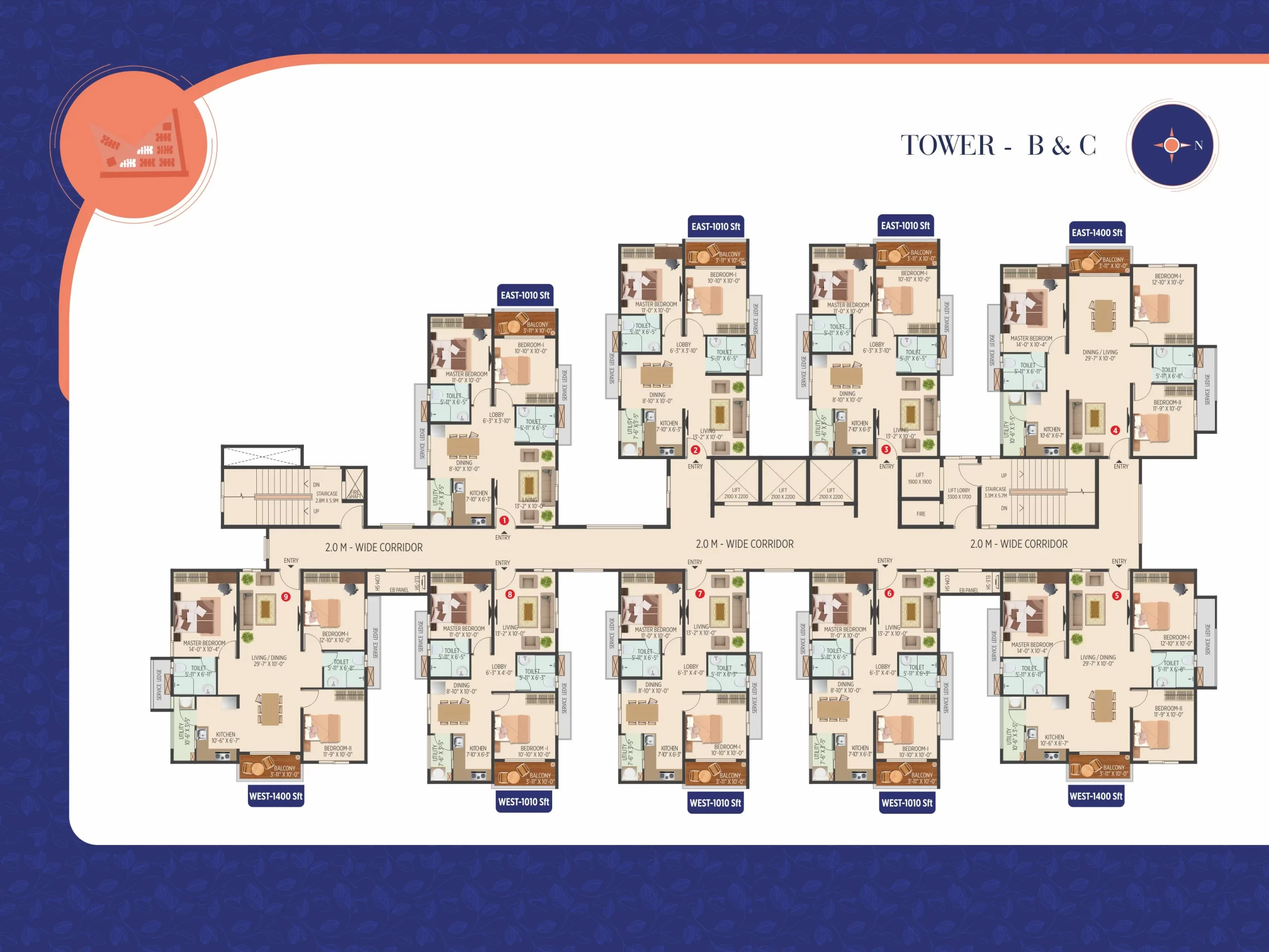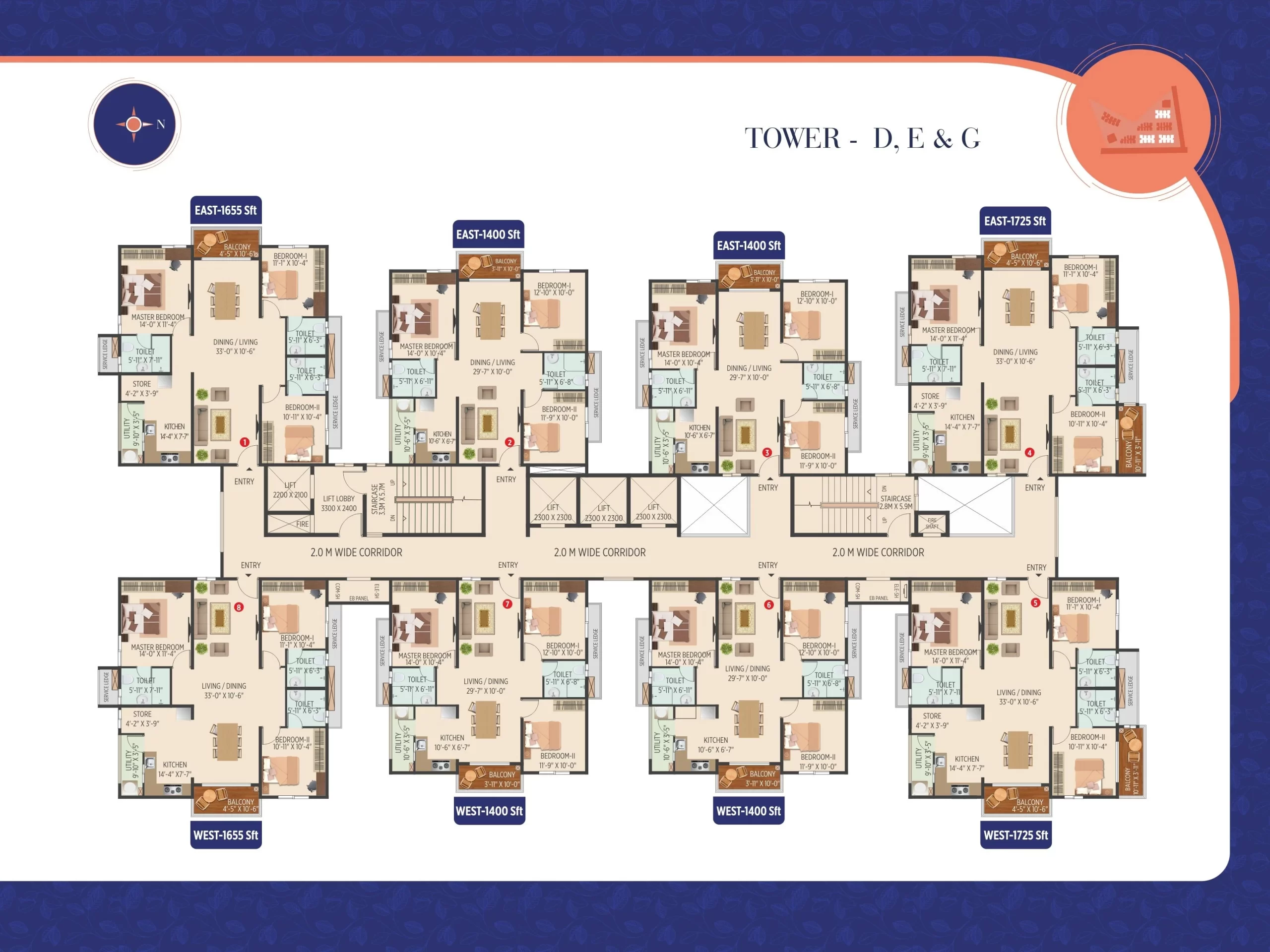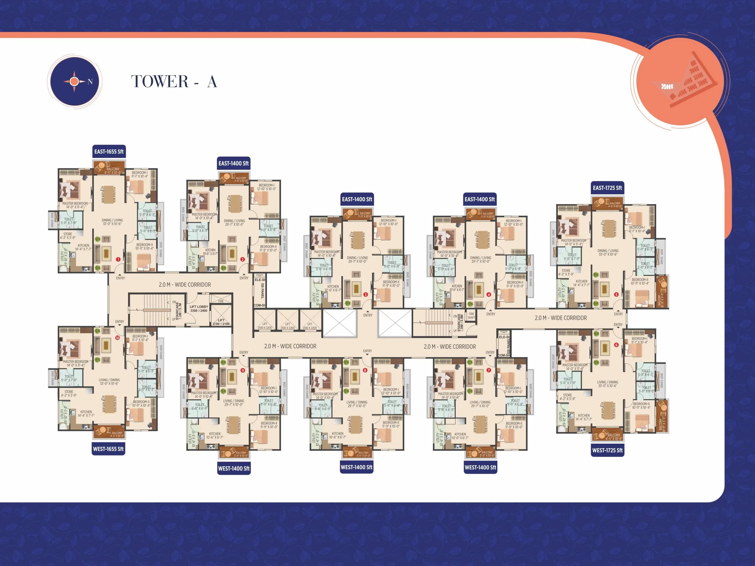 Four high speed lifts for each tower with Automatic Rescue Device. (8 to 16 Passenger and service/fire lift)