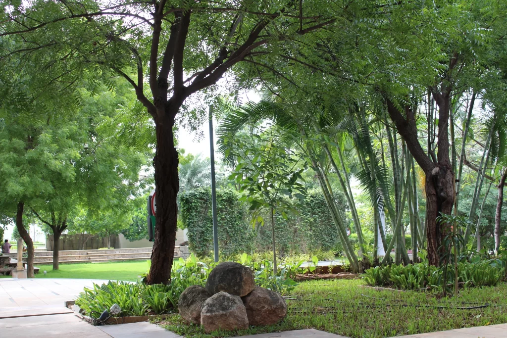 The community has theme parks based on medicinal plants and neem trees. The remarkable neem trees, revered in India for their medicinal and spiritual properties, also play an important role in air purification.